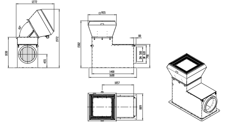 - 1 x Ansaugung stirnseitig mit Rohranschlussstutzen DN 500 mm