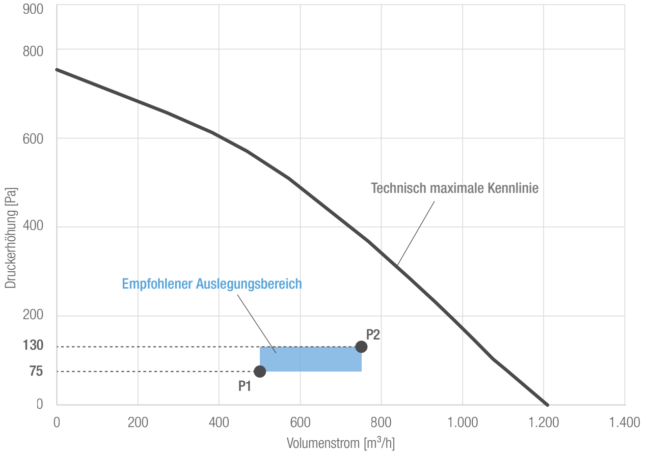 - Maximaler Volumenstrom zur Auslegung: 700 m³/h