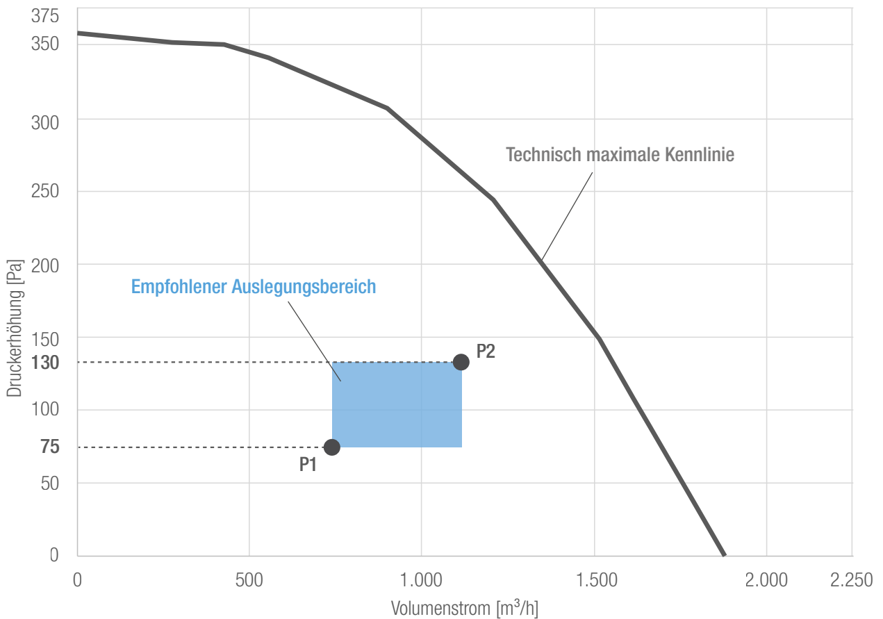 - Maximaler Volumenstrom zur Auslegung: 1.050 m³/h