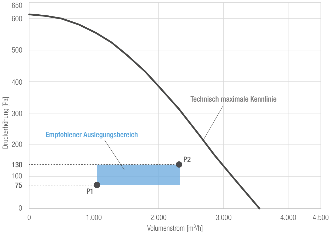 - Maximaler Volumenstrom zur Auslegung: 2.100 m³/h