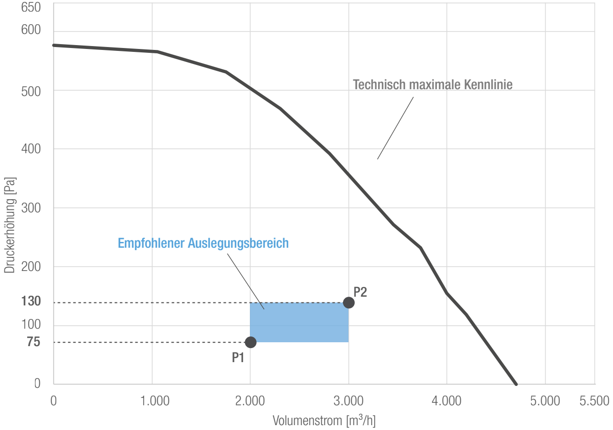 - Maximaler Volumenstrom zur Auslegung: 2.800 m³/h